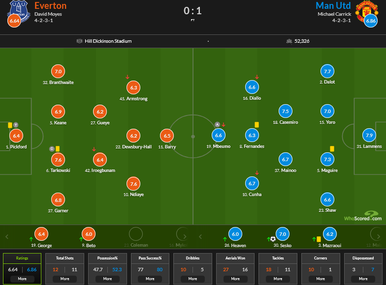 Το πρώτο ημίχρονο κύλησε σε χαμηλούς τόνους, με τις δύο ομάδες να εμφανίζονται αρκετά προσεκτικές και το παιχνίδι να είναι “κλειστό”. Ο David Moyes παρέταξε την ομάδα με τρεις αλλαγές, ξεκινώντας τους Harrison Armstrong, Michael Keane και Tim Iroegbunam, θέλοντας να δώσει φρεσκάδα μετά το αποτέλεσμα με την Μπόρνμουθ. Αν και η Μάντσεστερ Γιουνάιτεντ είχε την πρωτοβουλία των κινήσεων, καμία από τις δύο πλευρές δεν κατάφερε να βρει τον δρόμο προς τα δίχτυα, με τη μοναδική μεγάλη στιγμή να έρχεται για τους φιλοξενούμενους, όταν ο Bryan Mbeumo αστόχησε από πλεονεκτική θέση μετά από παρέμβαση του James Tarkowski.