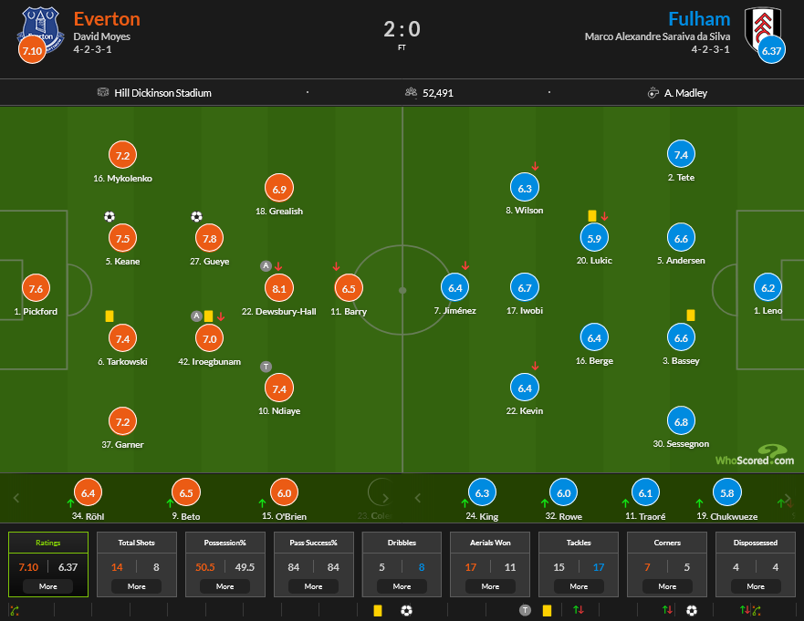 Η Έβερτον επέστρεψε στις νίκες με μια πειστική εμφάνιση απέναντι στη Φούλαμ, επικρατώντας με 2-0 στο Hill Dickinson Stadium. Η ομάδα του David Moyes έδειξε αποφασισμένη να κλείσει με θετικό πρόσημο πριν τη διακοπή των εθνικών ομάδων και πρόσφερε ίσως την πιο ολοκληρωμένη εμφάνισή της στη σεζόν. Οι Idrissa Gana Gueye και Michael Keane ήταν οι σκόρερ της νίκης μιας Έβερτον που σκόραρε 3 ακόμα γκολ που ήταν όμως οφ-σαίντ.