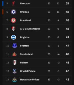 Για τον προπονητή δεν έχω να πω κάτι. Ο Moyes είναι ο Moyes με τα καλά του και τα κακά του. Παίρνει το 100 % από τους παίκτες αλλά εύκολα τον διαβάζεις, οι αντίπαλοι προπονητές ξέρουν ακόμη και τις αλλαγές του πριν το παιχνίδι χάνει ή κερδίζει η Εβερτον. Ίσως το να αλλάξει παίκτες ενώ έχει σίγουρα 15 λεπτά ακόμη στο 87′ δεν αξίζει το ρίσκο. Τώρα θα μου πεις ο άλλος έβαλε στο 84′ Kerkez,Fribong,Mac Allister παίκτες που αγοράστηκαν με αρκετά χρήματα. Προτίμησε να κρατήσει τα κουρασμένα πόδια τον Garner,Ndiaye,Gueye. Δεν το λέω με την άποψη ότι δεν θα χάναμε αν έκανε αλλαγές αλλά θα μπορούσε να αλλάξει κάποιον για να βάλει παίκτες να τρέξουν λίγο περισσότερο στα τελευταία λεπτά. Ίσως να μην χρειαζόταν αλλαγές γιατί είχαμε στο 2ο ημίχρονο παιχνίδι περπατητό για 30 λεπτά οπότε δεν ήταν κουρασμένοι οι παίκτες μας. Όχι ότι θα γλιτώναμε το γκολ το γράφω ξανά δεν το λέω με αυτή την σκέψη, αλλά με την σκέψη του θα βάλω Röhl ή iroegbunam να κοντράρει τον φρέσκο Mac Allister. Οι αλλαγές που έκανε η μια ήταν αναγκαστική και δεν είχαμε κάτι αλλο να κάνουμε ο Barry αλλά και ο George απλά κουνούσαν το κορμί τους στο γήπεδο για 25 λεπτά. Στα χαρτιά εμείς και η Newcastle είμαστε οι χαμένοι της Αγωνιστικής αφού οι υπόλοιποι πήραν από κάτι. Η επόμενη αγωνιστική θα διεξαχθεί κατα την διάρκεια της εβδομάδας καθώς το επόμενο Σαββατοκύριακο διεξάγονται και οι ημιτελικοί του FA cup στο Wembley. Βάζω και την Crystal Palace στην εξίσωση της ευρωπαϊκής θέσης παρόλο που είμαι σίγουρος όταν θα ξεκινήσουν οι ημιτελικοί για το Conference οι ομάδα θα πετάξει ”Λευκή Πετσέτα” στους αγώνες της Premier League όμως έχει δύο παιχνίδια λιγότερα και με νίκη αύριο φτάνει 45. Έχουν σφίξει τα λουριά για εμάς γιατί είμαστε και πίσω σε διάφορα τερμάτων οπότε χάνουμε σχεδόν και όλες τις ισοβαθμίες. Ελπίδες όμως υπάρχουν αρκετές και η ομάδα έχει δείξει φέτος ότι μπορεί οπότε πάμε με θετική ενέργεια μέχρι το τέλος.