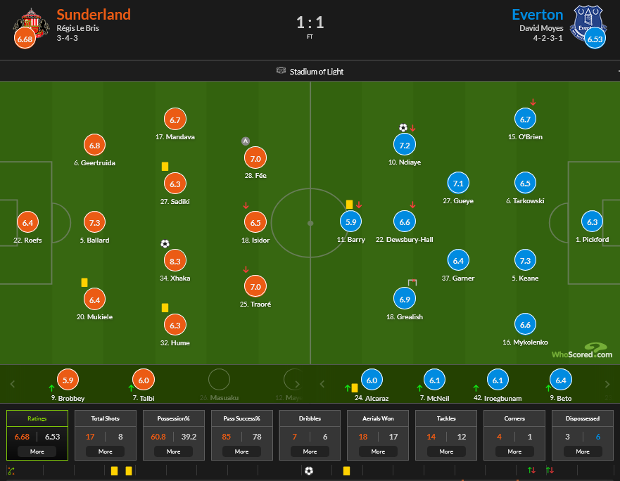 Η Έβερτον έδειξε ξανά δύο διαφορετικά πρόσωπα στα δύο ημίχρονα και κατάφερε να πάρει έναν δίκαιο, αλλά και πικρό συνάμα, βαθμό από την ανεβασμένη Σάντερλαντ. Το παιχνίδι είχε ταχύτητα, ένταση και σίγουρα κράτησε σε αγωνία τους φίλους της ομάδας μας μέχρι το τελευταίο σφύριγμα.