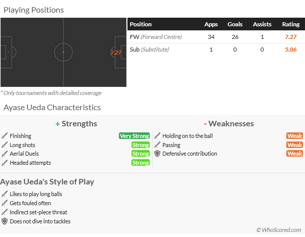 Ο Ayase Ueda αποτελεί αυτή τη στιγμή ένα από τα πιο ενδιαφέροντα ονόματα στην ευρωπαϊκή αγορά, έχοντας εξελιχθεί σε έναν εξαιρετικά αποτελεσματικό επιθετικό. Πρόκειται για έναν ποδοσφαιριστή που συνδυάζει την παραδοσιακή ιαπωνική πειθαρχία με την ευρωπαϊκή κυνικότητα μπροστά από την εστία. Αν και δεν βασίζεται αποκλειστικά στη σωματική διάπλαση, διακρίνεται για το εντυπωσιακό του άλμα και την ικανότητά του στο ψηλό παιχνίδι, ενώ η άνεση που έχει να τελειώνει τις φάσεις και με τα δύο πόδια τον καθιστά απρόβλεπτο για κάθε αμυντικό.